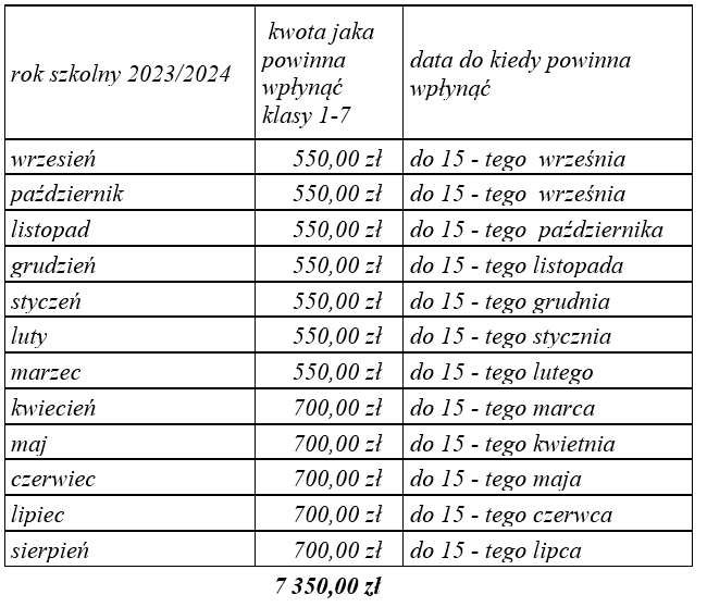 rok szkolny 2024/2025 | kwota jaka powinna wpłynąć klasy 1-3 | data do kiedy powinna |