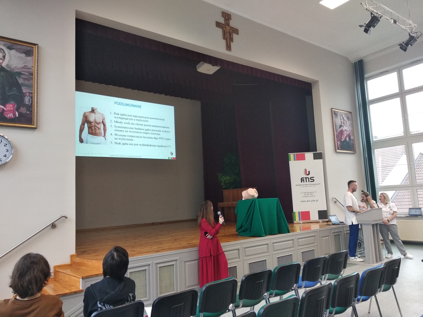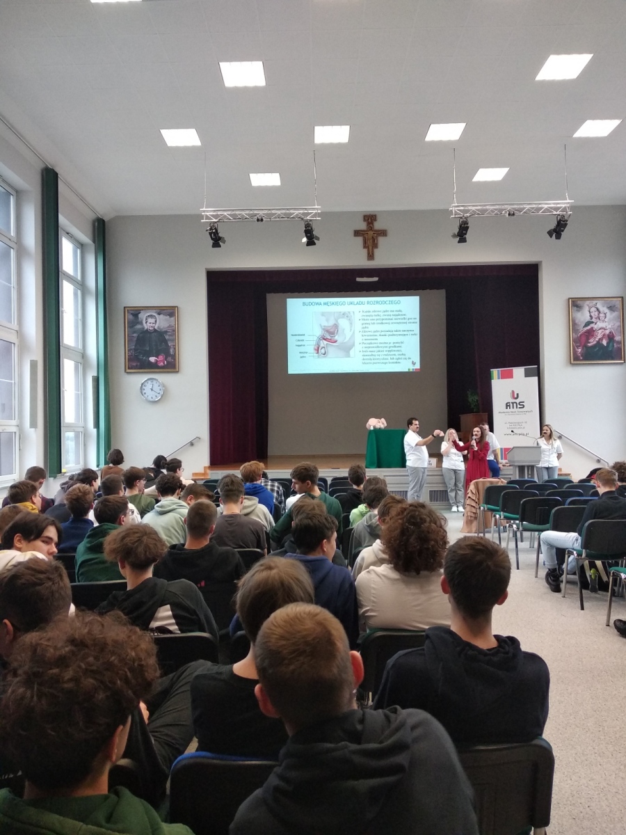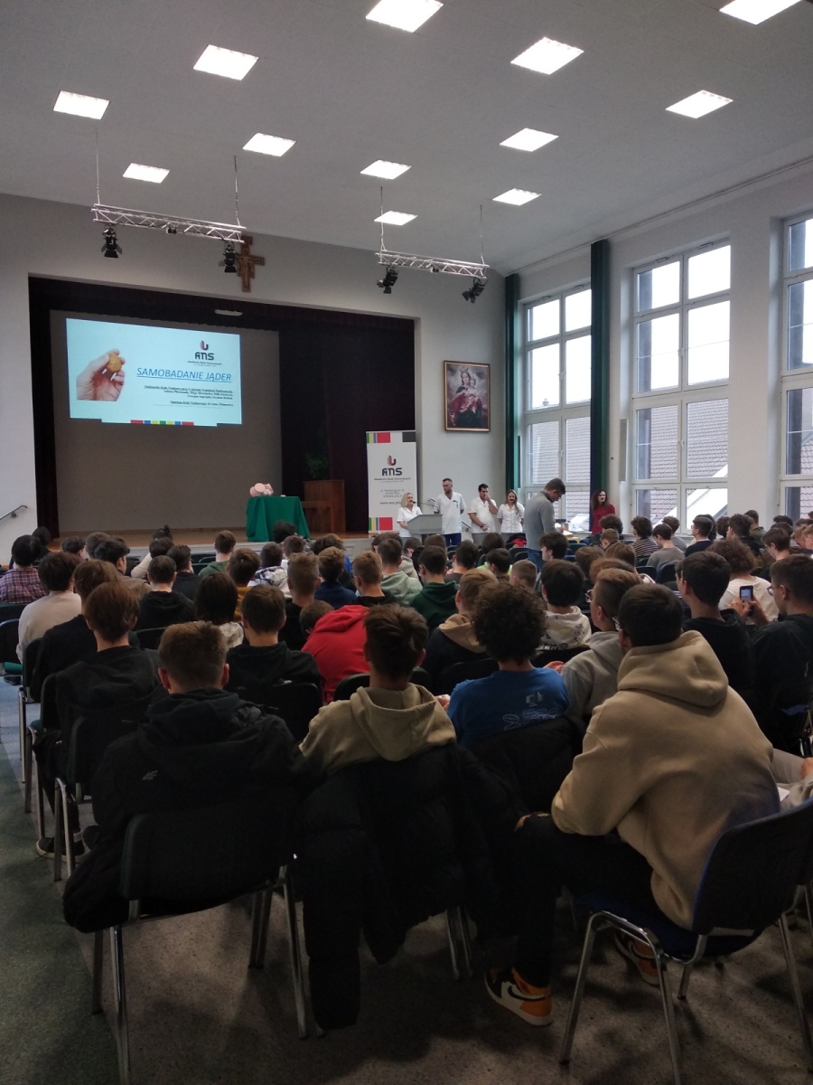 Dziękujemy w szczególności studentom pielęgniarstwa i pracownikom z Akademii Nauk Stosowanych w Pile (tj. członkom Studenckiego Koła Naukowego przy Centrum Symulacji Medycznych) za spotkanie w auli, gdzie uświadamiano licealistów o: zagrożeniu rakiem jąder, czynnikach ryzyka zachorowania na nowotwory oraz konieczności wyrobienia nawyku regularnej samokontroli.