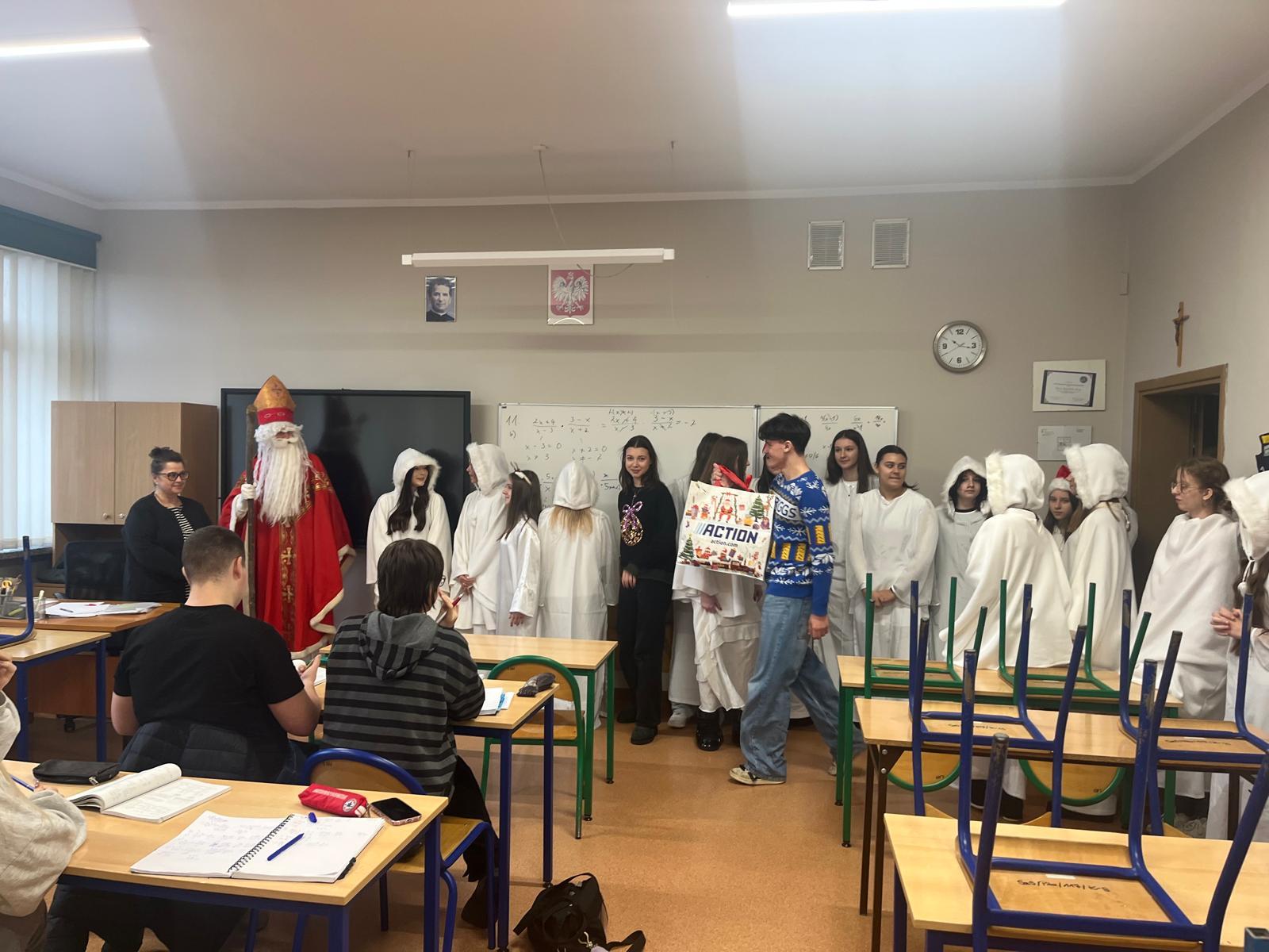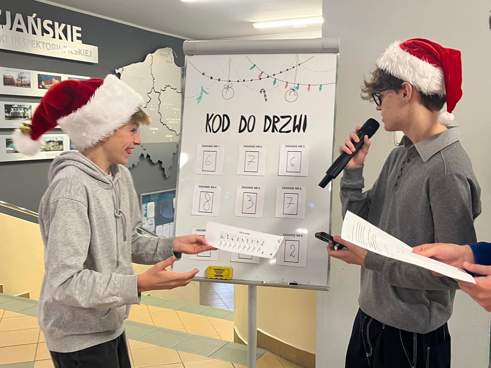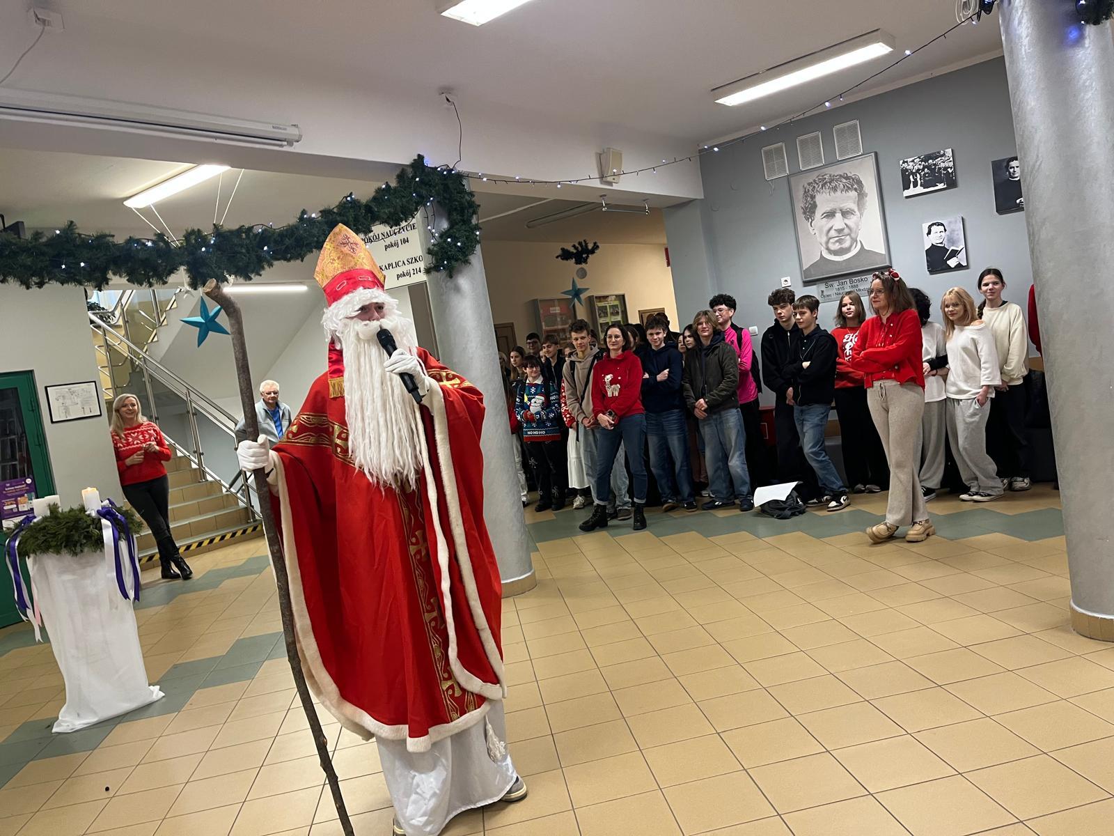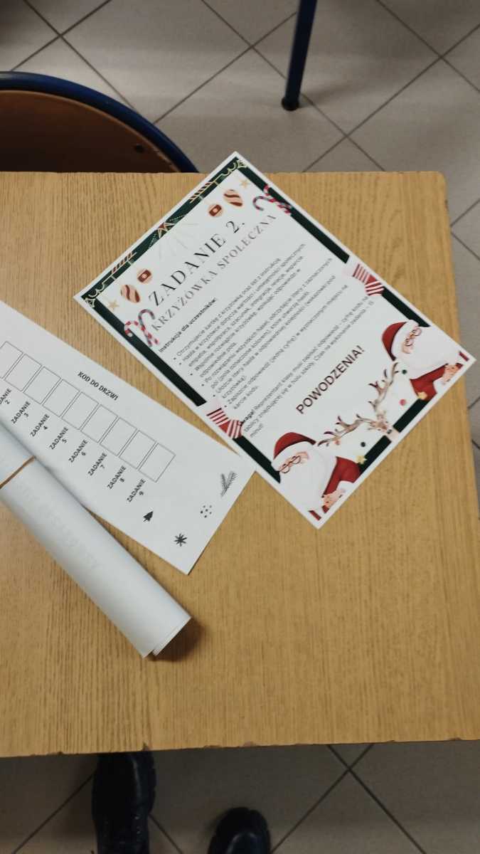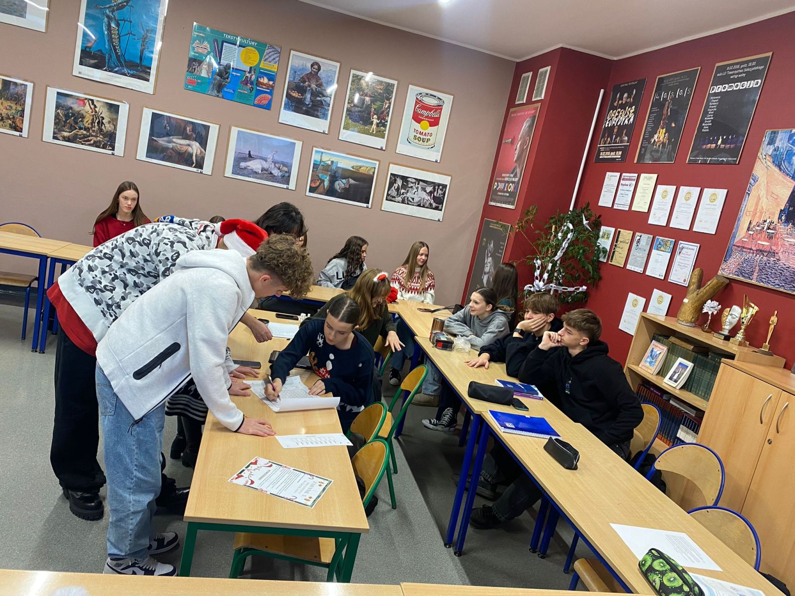 Samorząd Uczniowski w tym roku przygotował mikołajkową niespodziankę, a mianowicie: uczniowie wszystkich klas musieli rozwiązać zadania / rebusy, aby uwolnić Świętego Mikołaja, który został uwięziony pod tajemnym kodem.