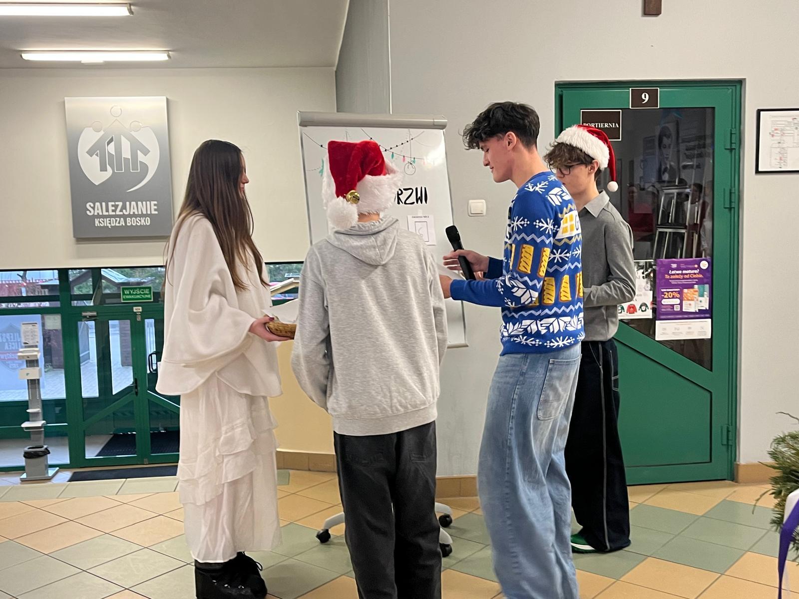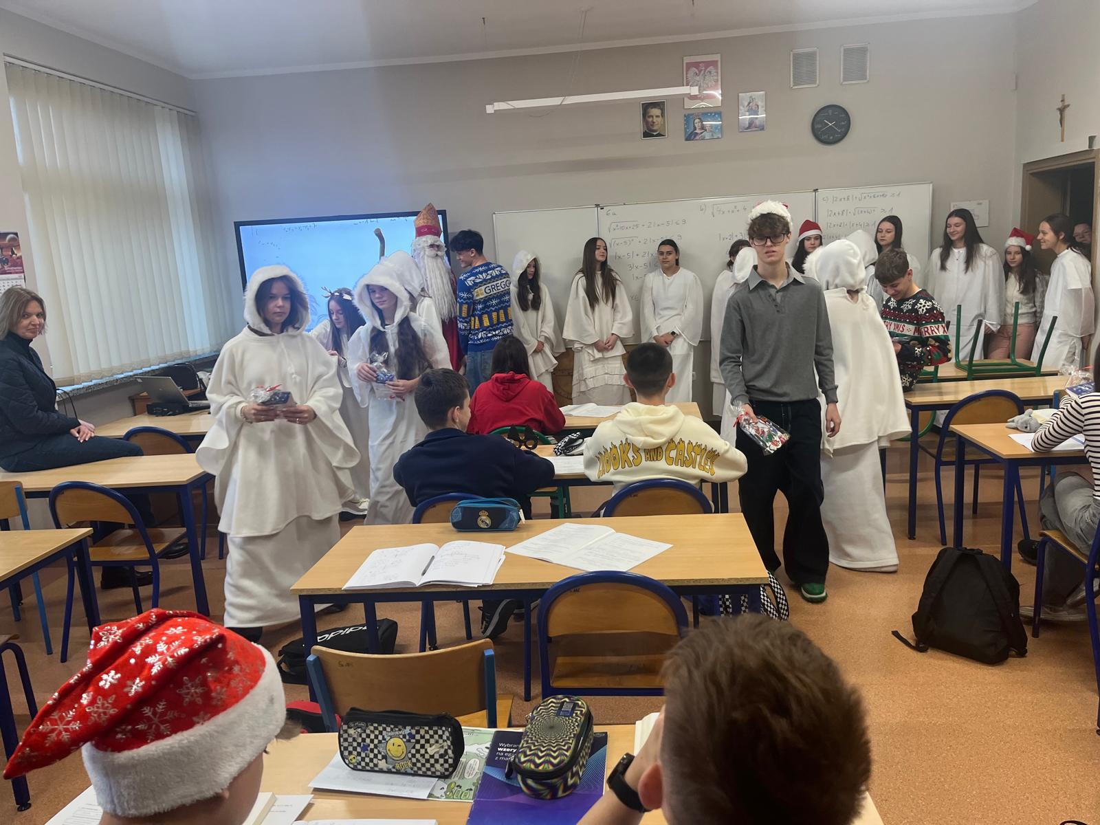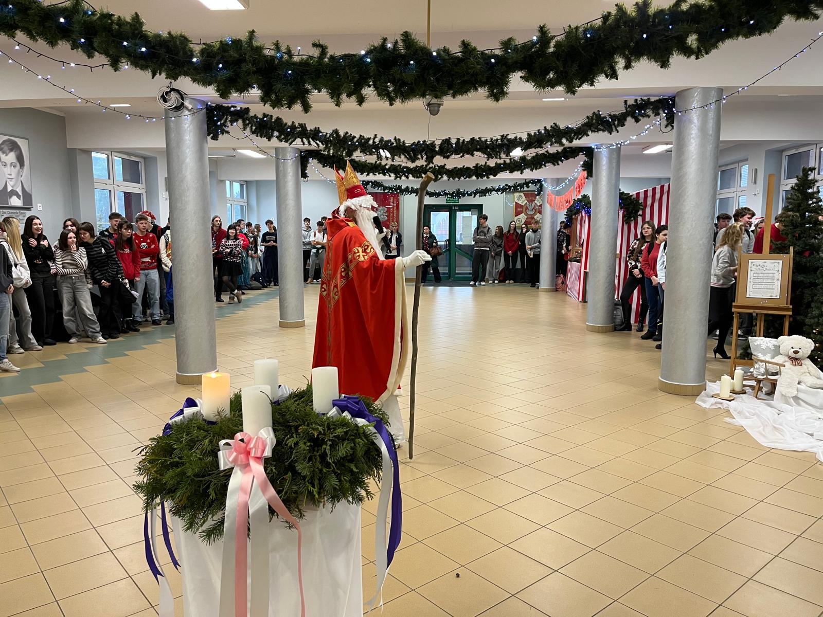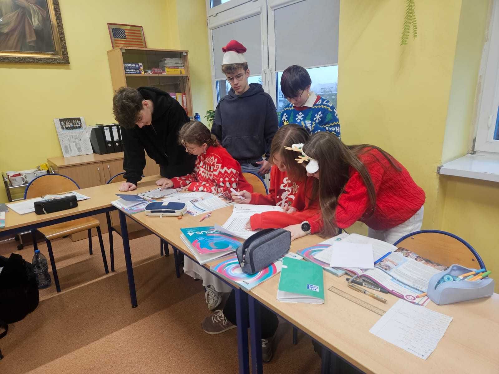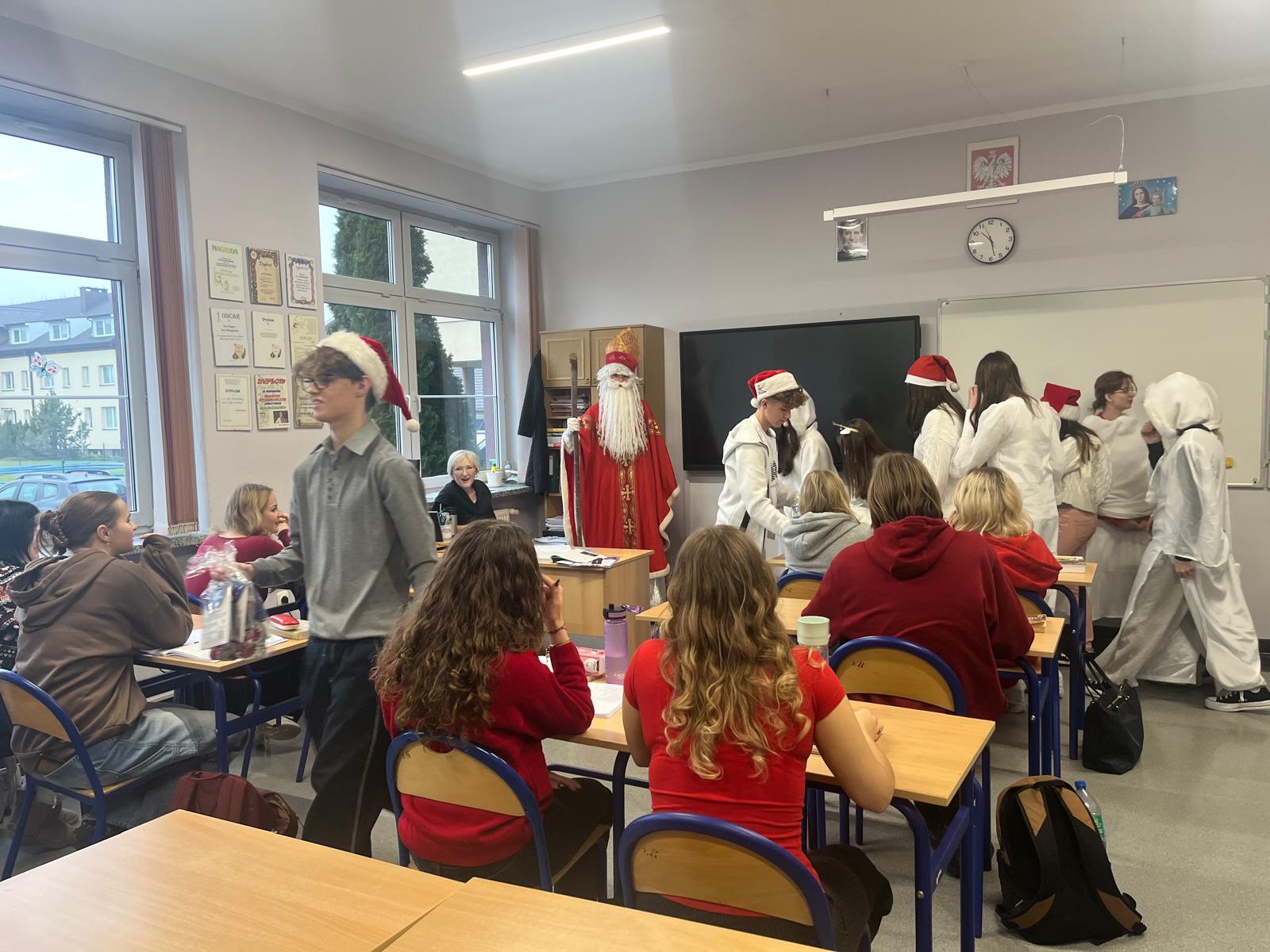 Samorząd Uczniowski w tym roku przygotował mikołajkową niespodziankę, a mianowicie: uczniowie wszystkich klas musieli rozwiązać zadania / rebusy, aby uwolnić Świętego Mikołaja, który został uwięziony pod tajemnym kodem.