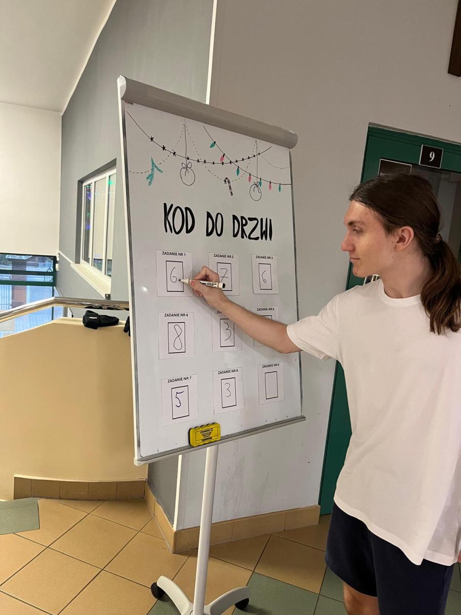 Każda klasa otrzymała zadanie, którego wynikiem była cyfra do kodu otwierającego drzwi….. jak widać na fotorelacji udało się i Święty Mikołaj przybył nie tylko z dobrym słowem na „Słówko”, ale również z prezentami, których sponsorem była Rada Rodziców!