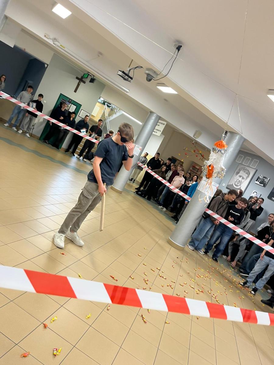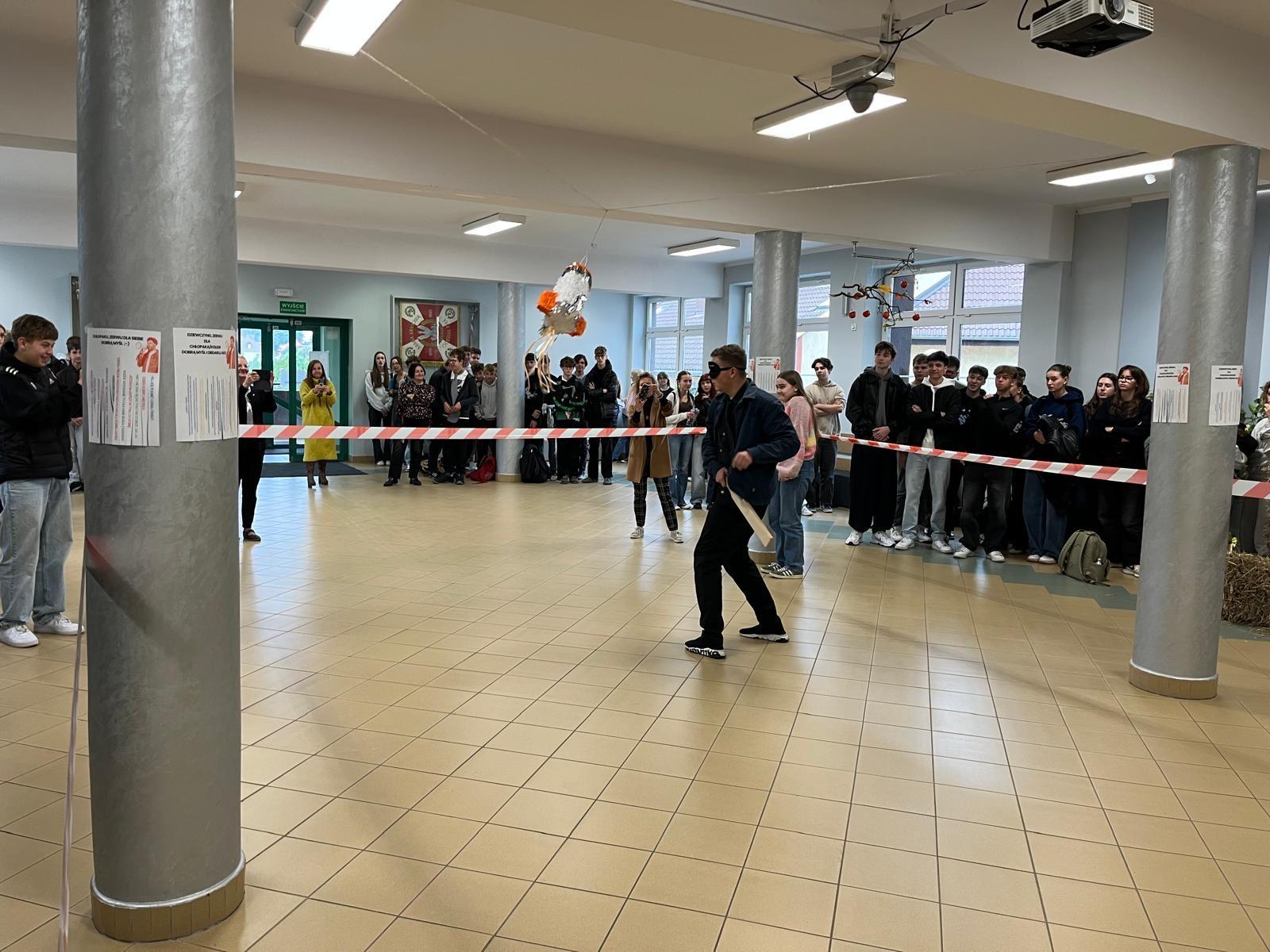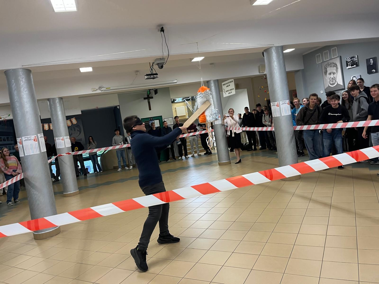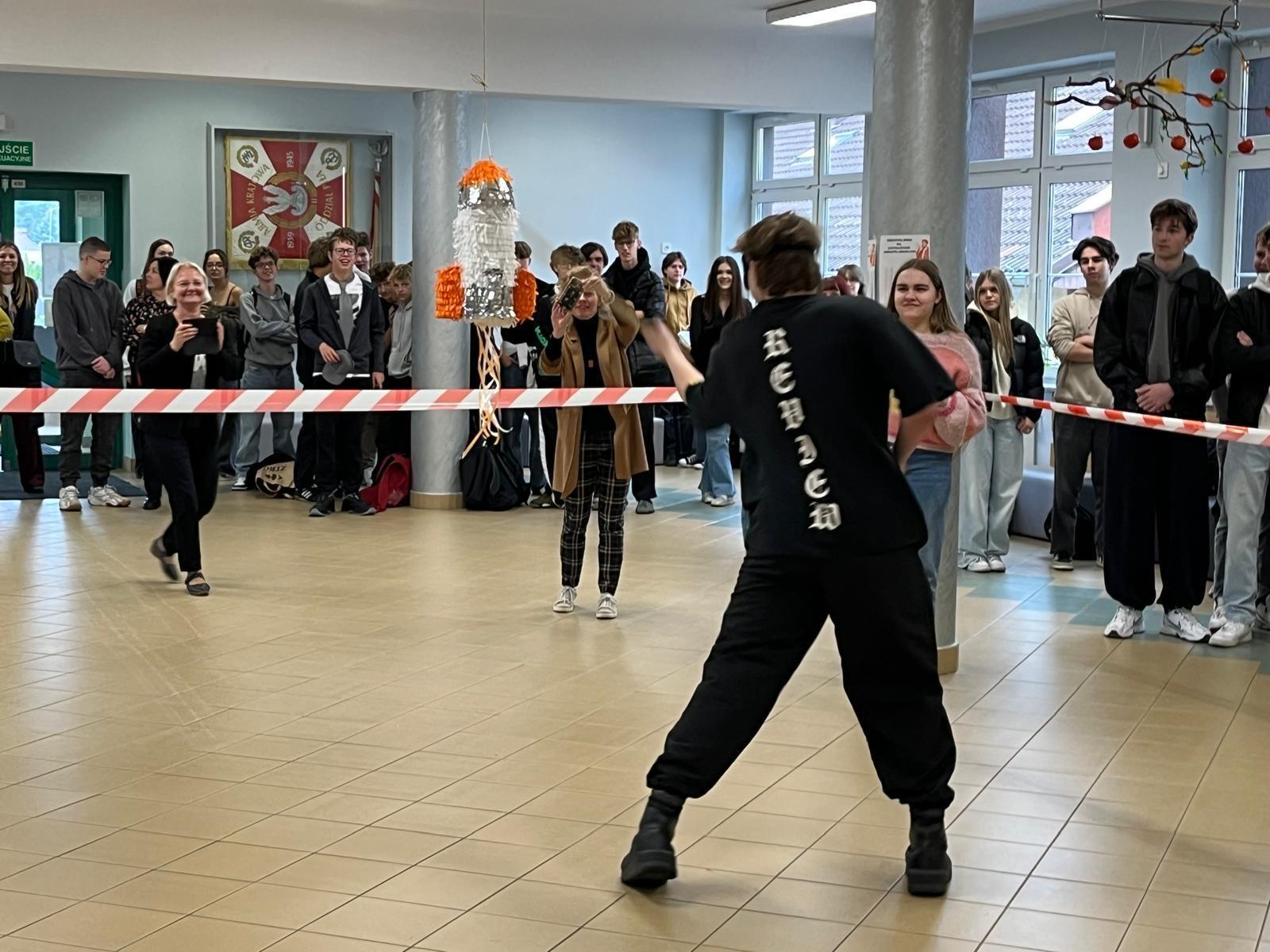 Na koniec Tymon Stasiaczek z klasy 2a rozbił – przygotowaną specjalnie na tę okazję i wypełnioną po brzegi